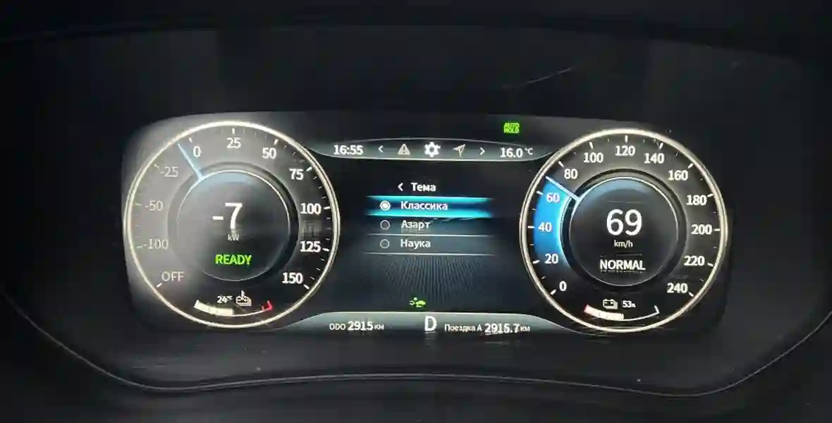 Вместо аналоговых приборов тут большой цифровой экран (10,25 дюйма), есть три темы оформления под названиями «Классика», «Азарт» и «Наука». В принципе все они выглядят неплохо, но только в «азартной» нет левого окошка, в котором мельтешат данные о расходе энергии.
